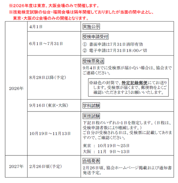 | ※技能検定試験の仙台・福岡会場は隔年開催しておりましたが当面の間、 中止とし、東京・大阪の2会場のみの開催となります。 |